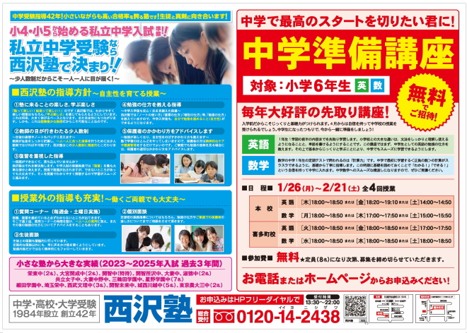 西沢塾の中学準備講座パンフレットアップいたしました。