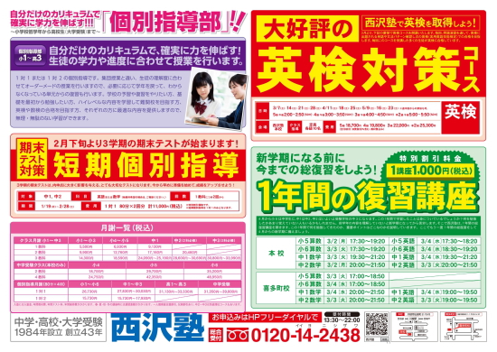 西沢塾新学期生募集アップいたしました。